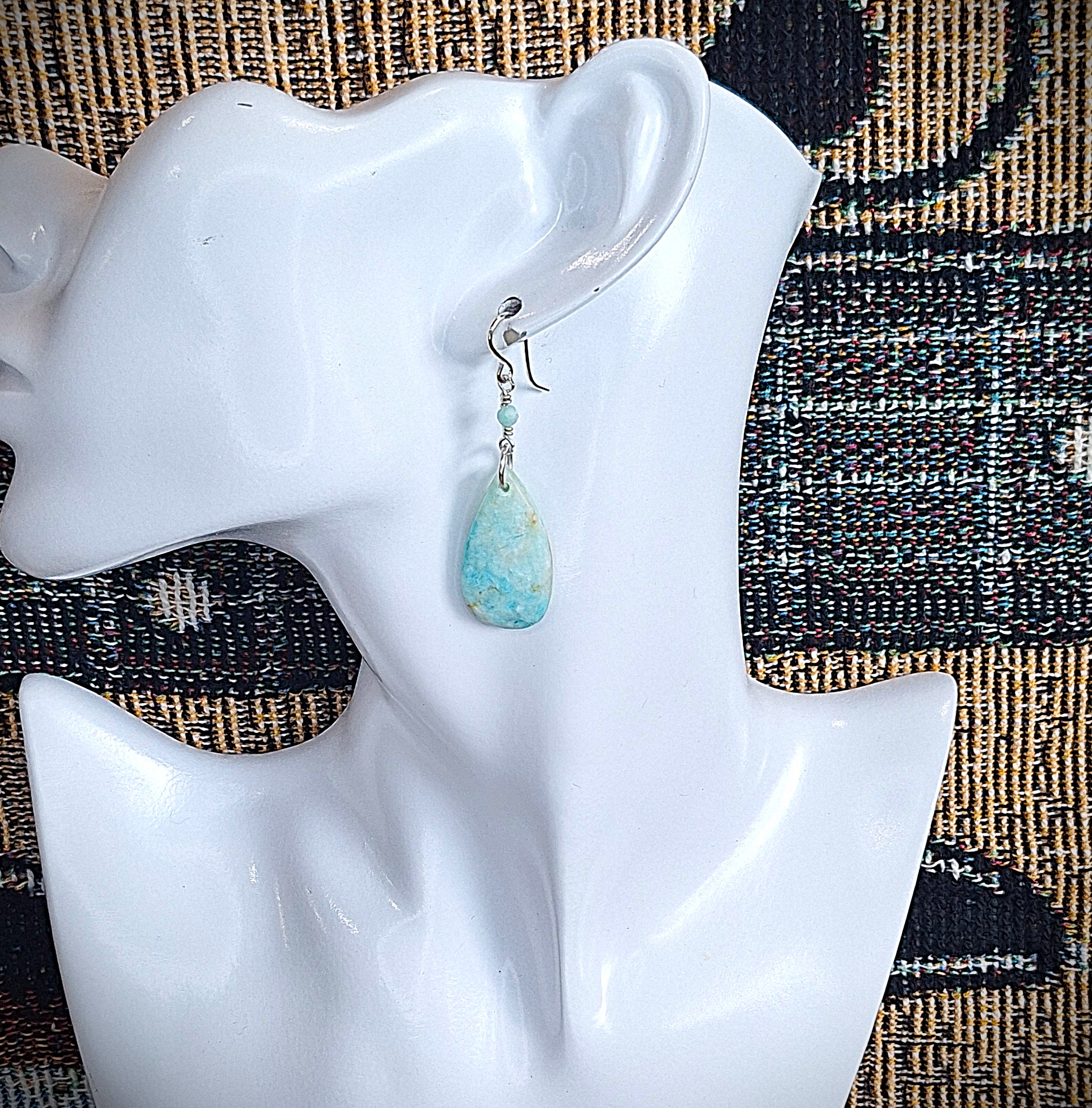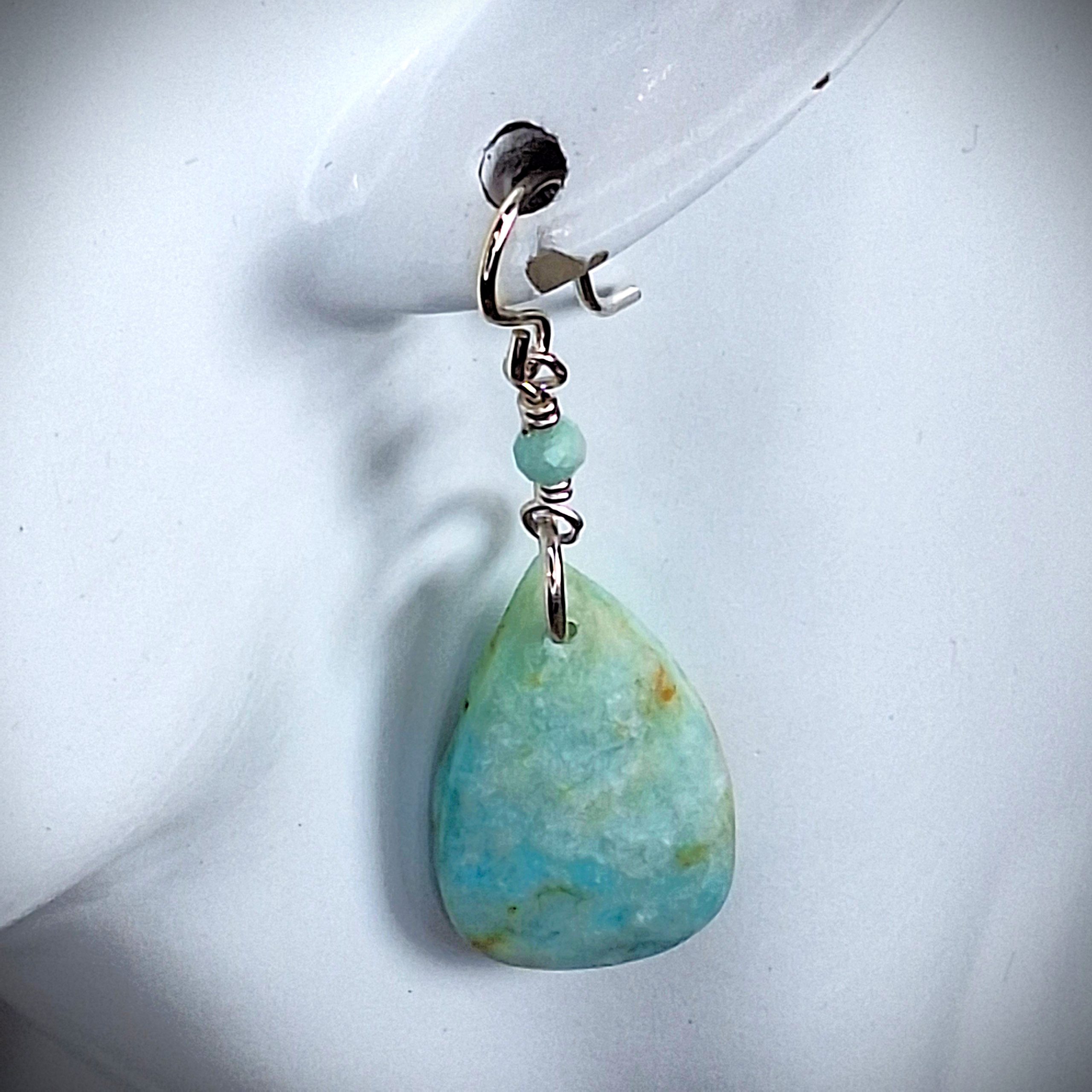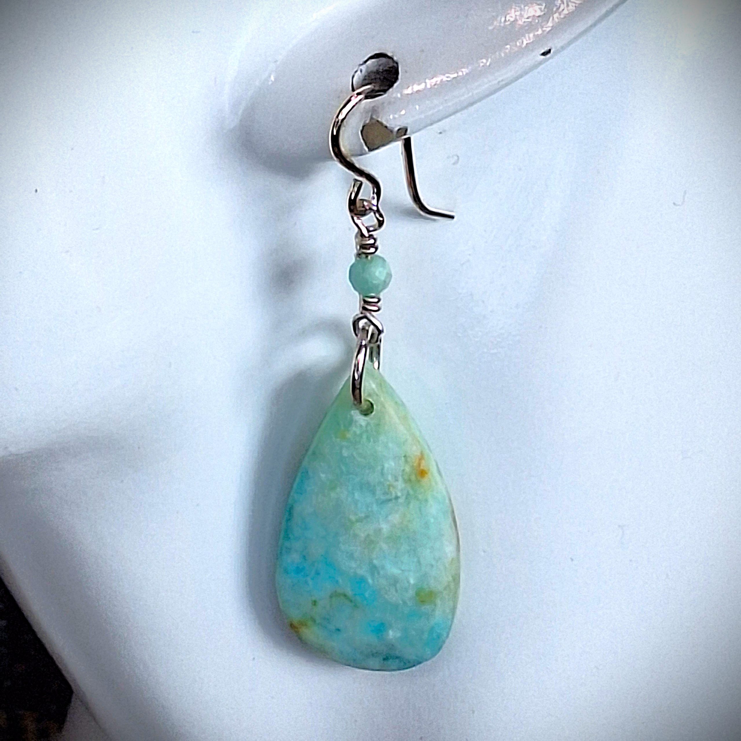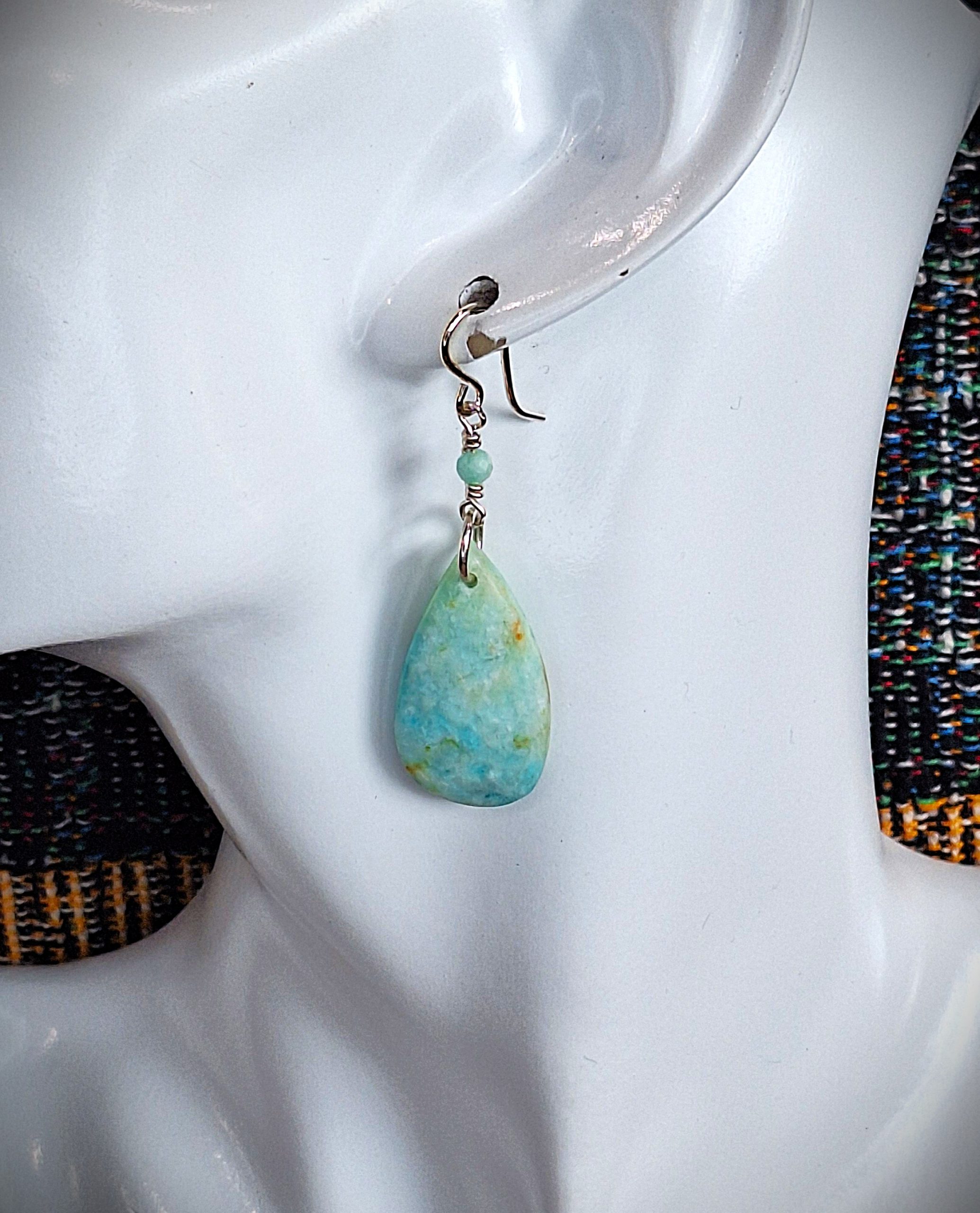 Elevate your style with these exquisite handmade earrings featuring natural Madagascar Amazonite gemstones in a stunning robin’s egg blue hue. Each teardrop stone is carefully wire-wrapped with 925 sterling silver, creating a delicate yet elegant design that sways beautifully with every movement.
